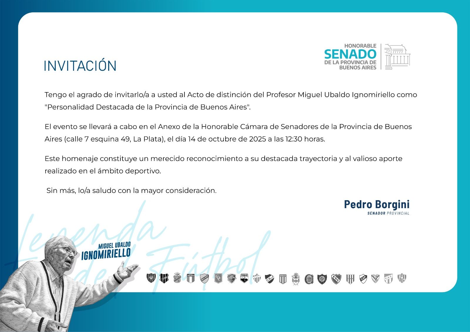El próximo martes 14 de octubre a las 12:30 horas, en el Anexo de la Honorable Cámara de Senadores de la Provincia de Buenos Aires (calle 7 esquina 49, La Plata), se llevará a cabo el acto de distinción al Profesor Miguel Ubaldo Ignomiriello, quien será reconocido como Personalidad Destacada del Deporte de la Provincia de Buenos Aires.